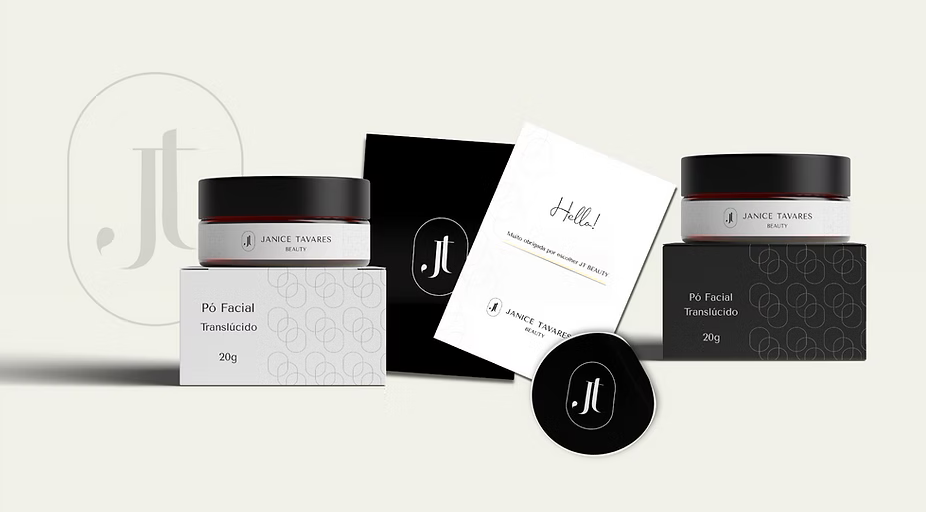 As iniciais possuem traços finos que carregam um ar sério e sofisticado. Elas estão interligadas representando conexão com o público, as formas arredondadas trazem maior proximidade e as cores predominantes são o preto e o branco e combinado com a fonte das palavras “Janice Tavares Beauty” em maiúsculo afloram o poder e a modernidade da marca.